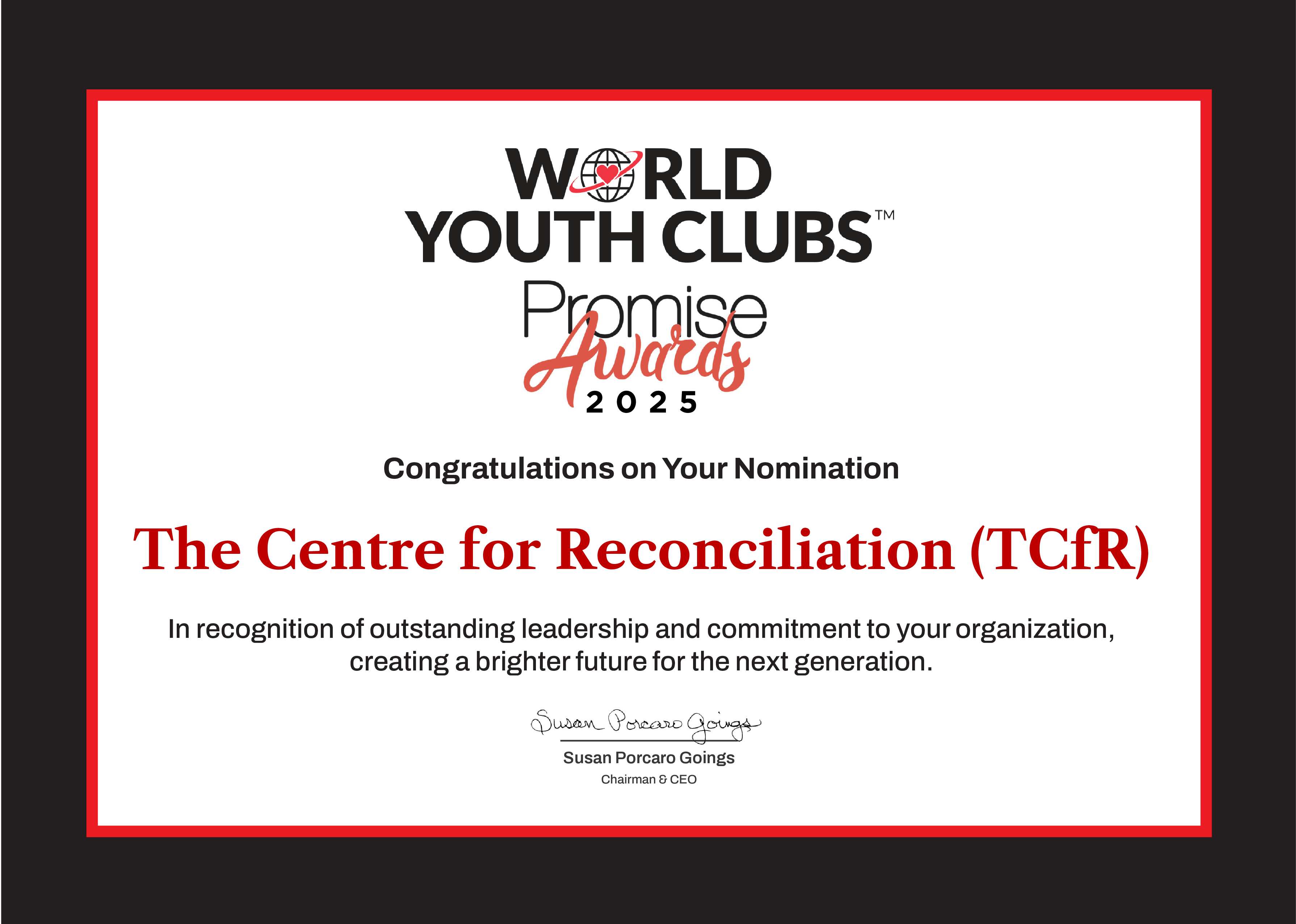 The Centre for Reconciliation is proud to announce its nomination for the prestigious 2025 World Youth Clubs (WYC) Promise Awards, which recognise organisations around the world that inspire young people, shape future leaders, and exemplify outstanding service and commitment to youth development.